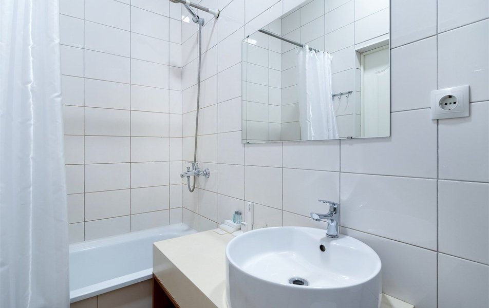 Санузел: ванна или душ, раковина, унитаз, тапочки, туалетные принадлежности, фен, халат