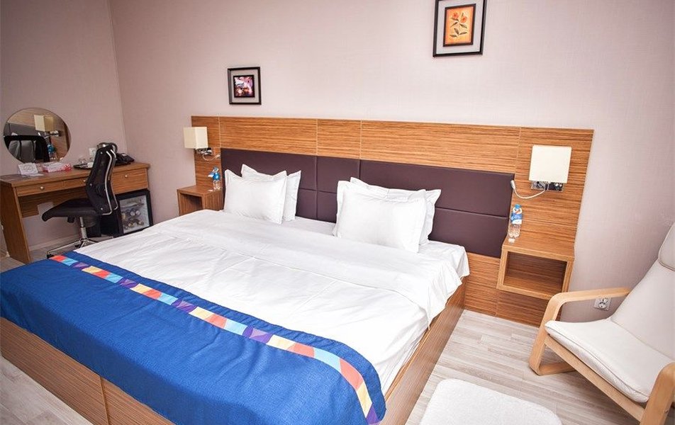 В номере: вешалка, зеркало, кресло, кровать двуспальная: «King size»: 200х220 мм или две односпальные кровати, прикроватные тумбочки, стол, столик журнальный, стул, шкаф-купе, кондиционер, мини-холодильник, сейф, телевизор ЖК, телефон, чайный набор посуды, электрочайник