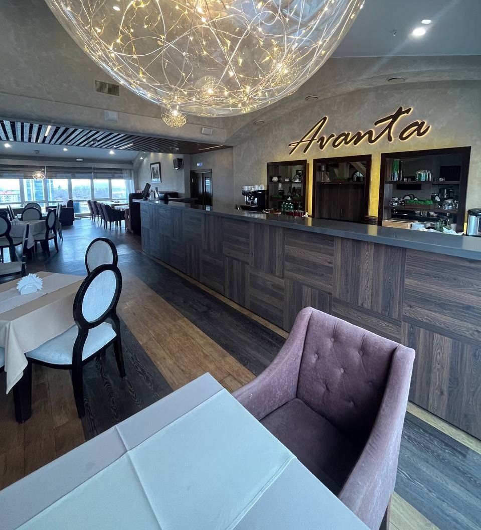 Интерьер ресторана, расположенного на девятом этаже гостинично-ресторанного комплекса «АВАНТА», оформлен в современном стиле, который сочетает в себе элегантность и комфорт. Система кондиционирования обеспечивает оптимальный микроклимат, а яркий свет софитов создает уютную и непринужденную атмосферу. Мягкие диваны и удобные зоны для отдыха приглашают гостей насладиться временем в приятной обстановке.