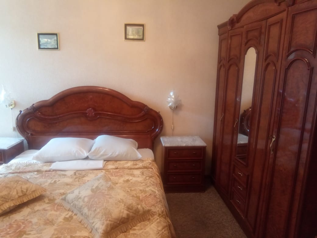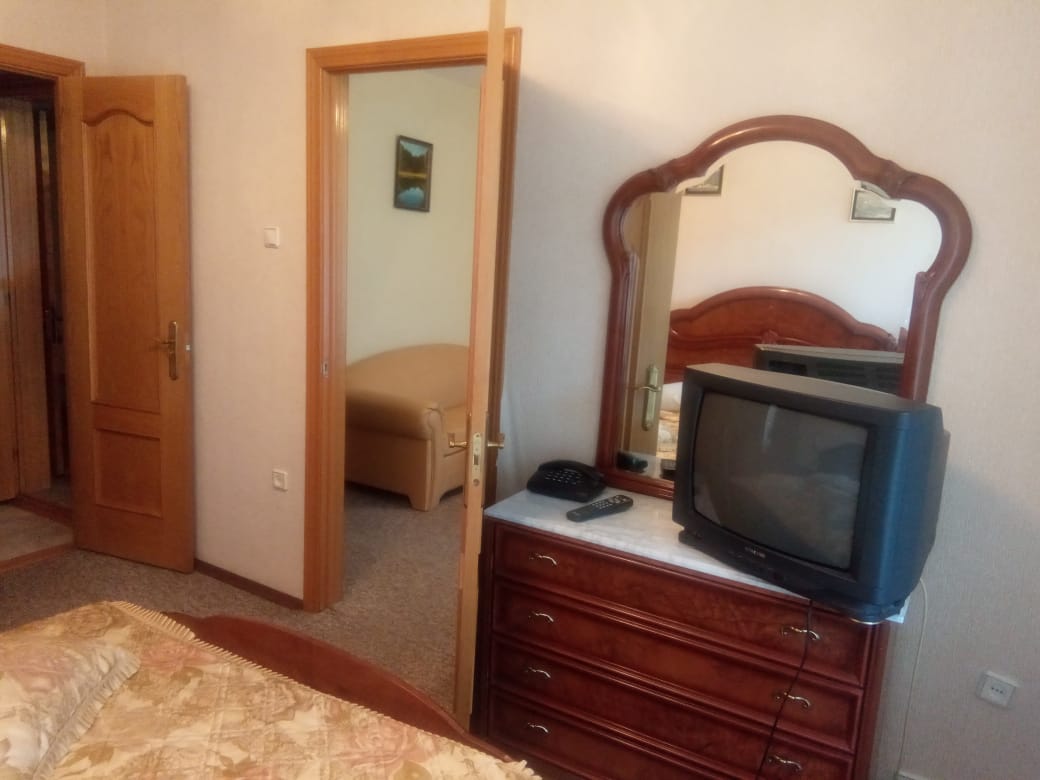 В номере: 1 двуспальная кровать(160х200), две тумбочки, шкаф-купе, телевизор. В гостиной набор мягкой мебели, столик, телевизор, набор посуды, чайник, кондиционер, утюг. Холодильник. Прихожая со шкафом для одежды.