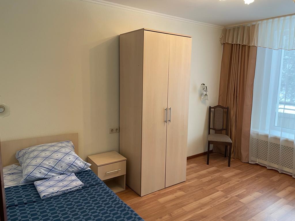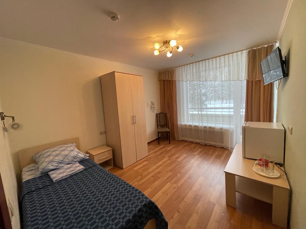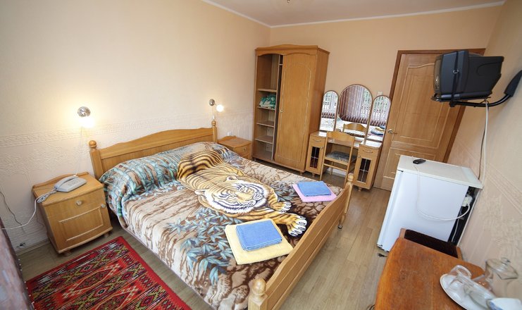 В номере: 1-спальная кровать, тумбочка, стул, столик, шкаф для одежды, телевизор, холодильник, набор посуды.