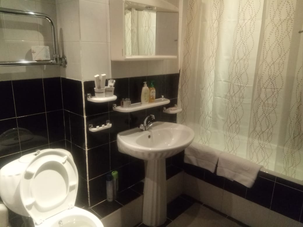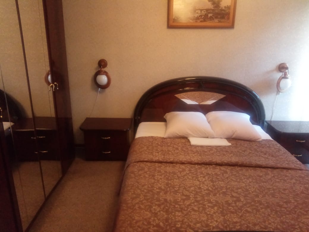 В номере: две 1-спальные кровати или одна двуспальная, тумбочка, стул, столик, шкаф для одежды, телевизор, холодильник, набор посуды, кондиционер, чайник, гладильная доска с утюгом.