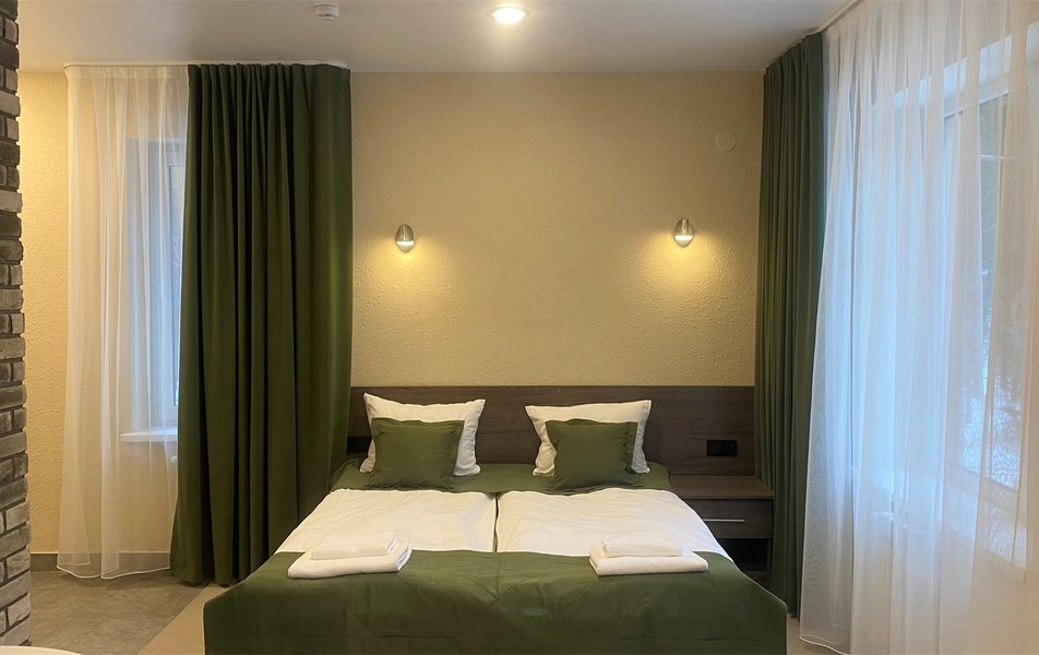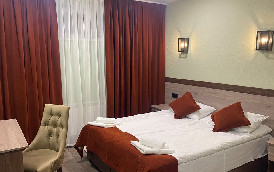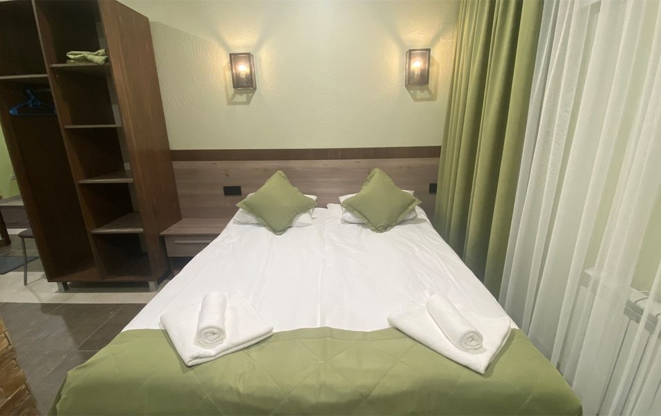 В номере: вешалка, кресло-кровать, зеркало, кровати односпальные /одна двуспальная кровать, прикроватные тумбочки, стол, стулья, шкаф, мини-кухня, кондиционер, набор посуды, сплит-система