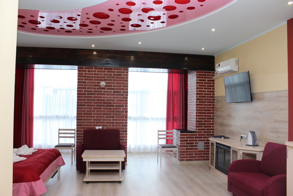 В номере: двуспальная кровать, прикроватные тумбы, стол, стулья, шкаф, два раскладывающихся кресла, журнальный столик, телевизор, холодильник, электрокамин, кондиционер, сейф, фен, электрочайник, утюг, гладильная доска, стиральная машина, набор посуды, лоджия
