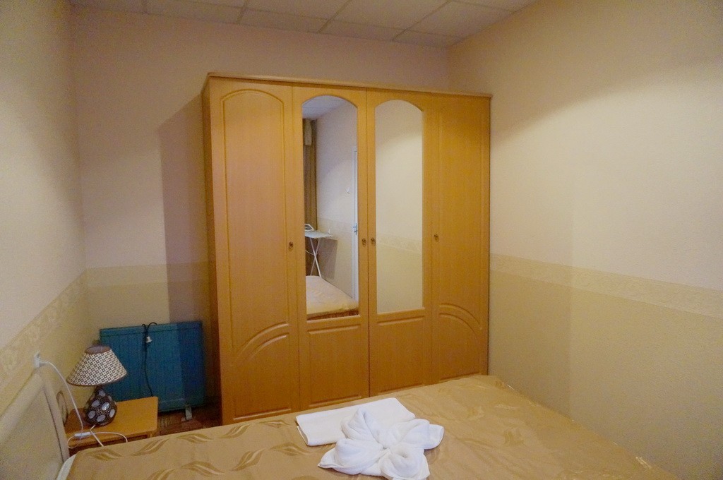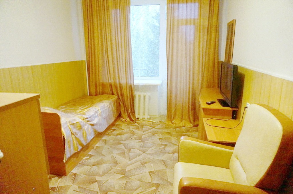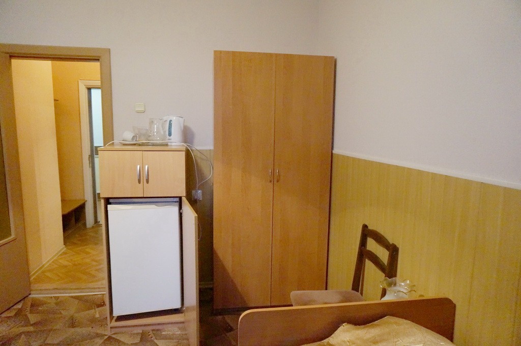 В номере: односпальная кровать, прикроватная тумба, стол, стул, шкаф, кресло раскладывающееся, телевизор, холодильник, электрочайник, набор посуды
