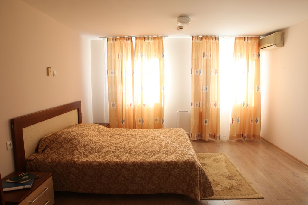 В номере: одна двуспальная кровать, прикроватные тумбы, шкаф, журнальный столик, мягкая мебель, кондиционер, спутниковое телевидение, холодильник, электрочайник