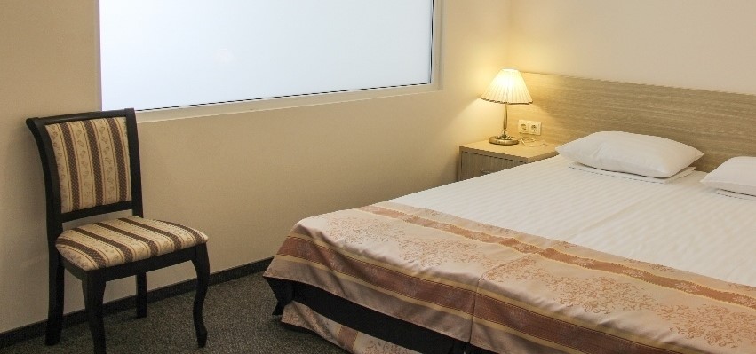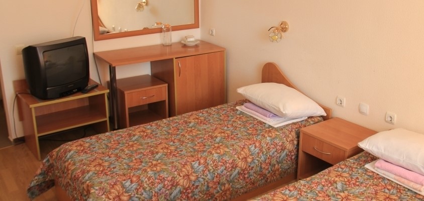 В номере: две односпальные кровати, платяной шкаф, прикроватные тумбы, туалетный столик, стулья, дополнительное место (раскладушка), набор посуды, холодильник, телевизор, кондиционер