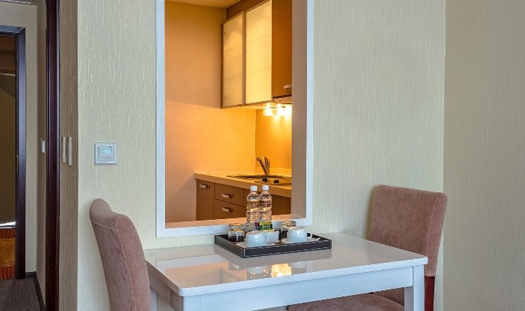 В номере: вешалка, зеркало, кровать двуспальная, набор мягкой мебели, прикроватные тумбочки, стол, стулья, шкаф, Мини-кухня, мини-холодильник, сейф, сплит-система, телевизор, телефон, чайный набор посуды, электрочайник