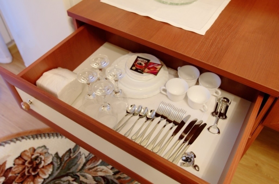 В номере: две односпальные кровати, стулья, кухонная мебель, телевизор, холодильник, электрочайник, набор посуды.