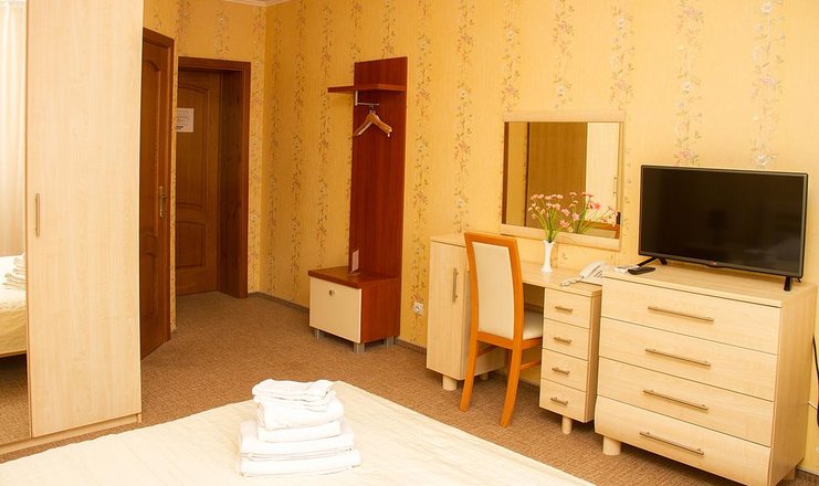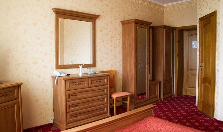 В номере: диван, зеркало, кровать двуспальная, прикроватные тумбочки, стол, стулья, кондиционер, мини-холодильник, сейф, телевизор ЖК, телефон