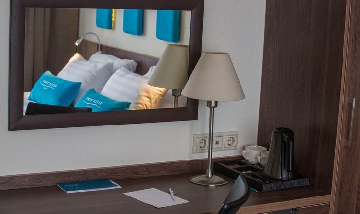 В номере: вешалка, зеркало, кровати односпальные или одна двуспальная, прикроватные тумбочки, стол, стулья, шкаф, кондиционер, телевизор, телефон, холодильник, набор посуды