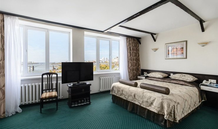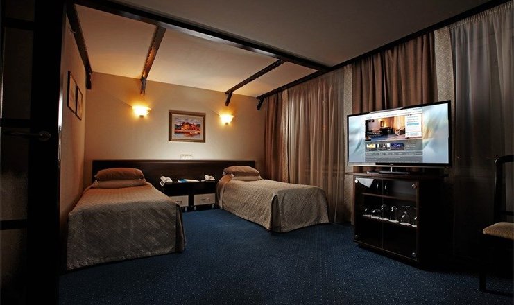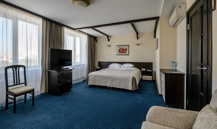 В номере: вешалка, зеркало,кресла, кровати односпальные или одна двуспальная, прикроватные тумбочки, стол, стулья, шкаф, кондиционер, телевизор, телефон, холодильник, набор посуды