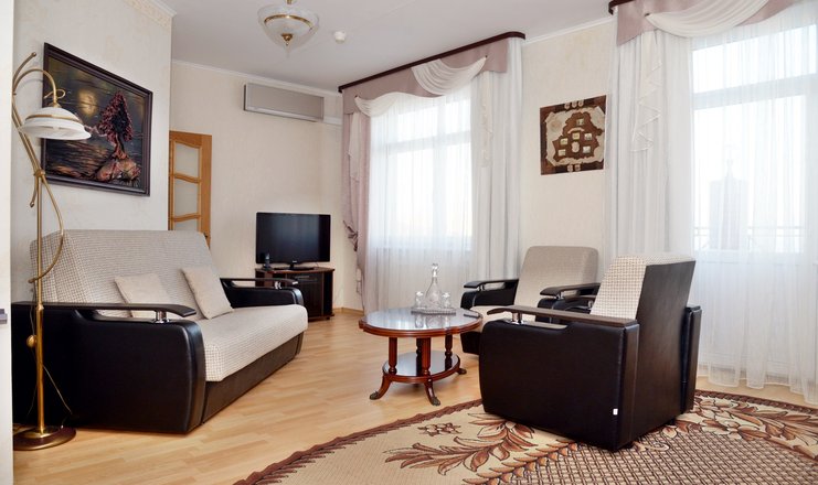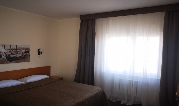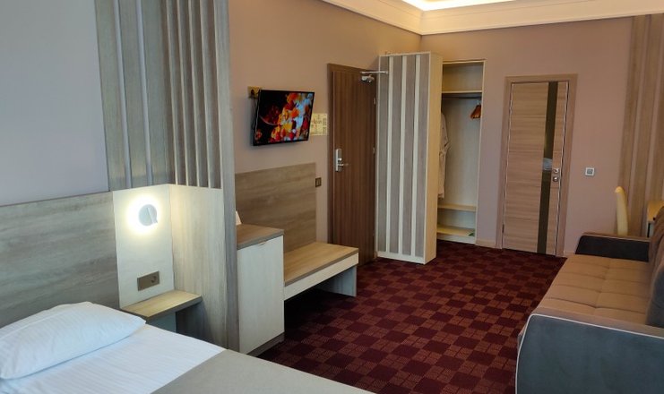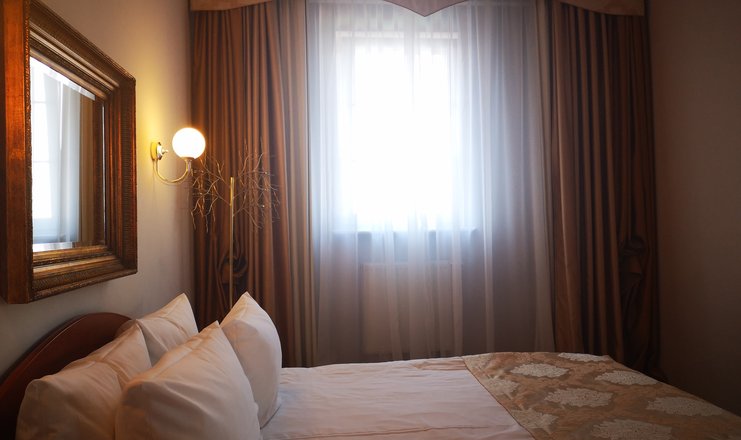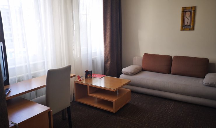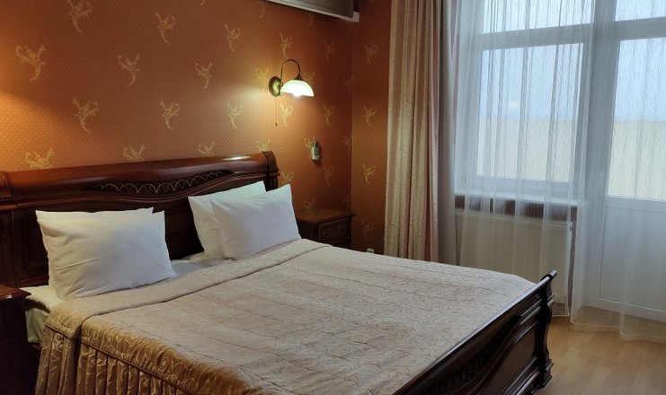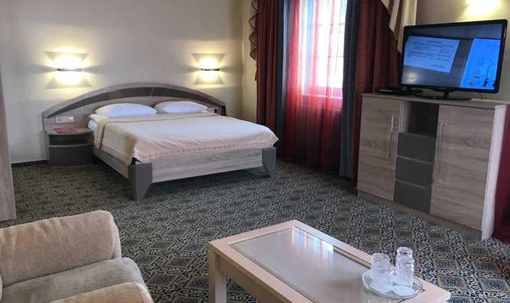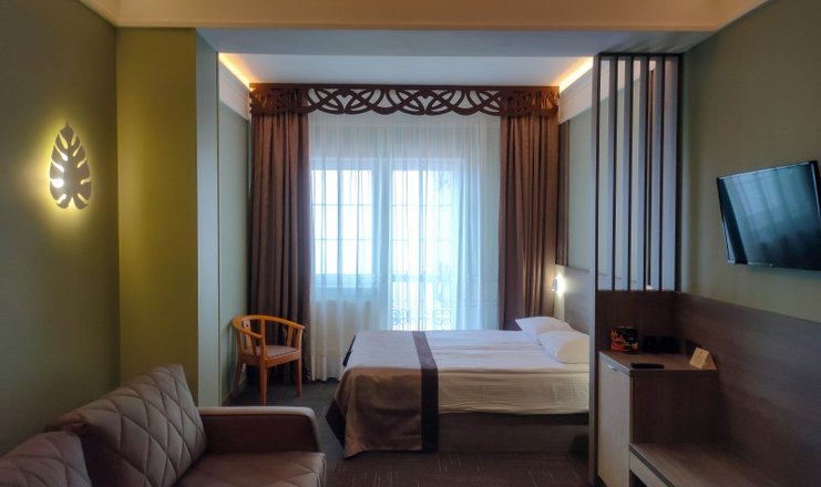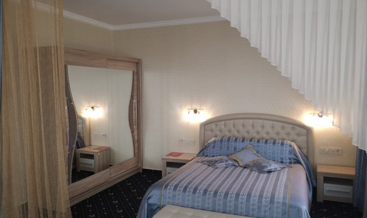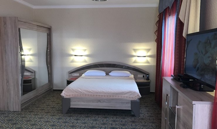 В номере: диван, зеркало, кровать двуспальная, прикроватные тумбочки, стол, стулья, тумба багажная, шкаф, мини-холодильник, телевизор ЖК, телефон