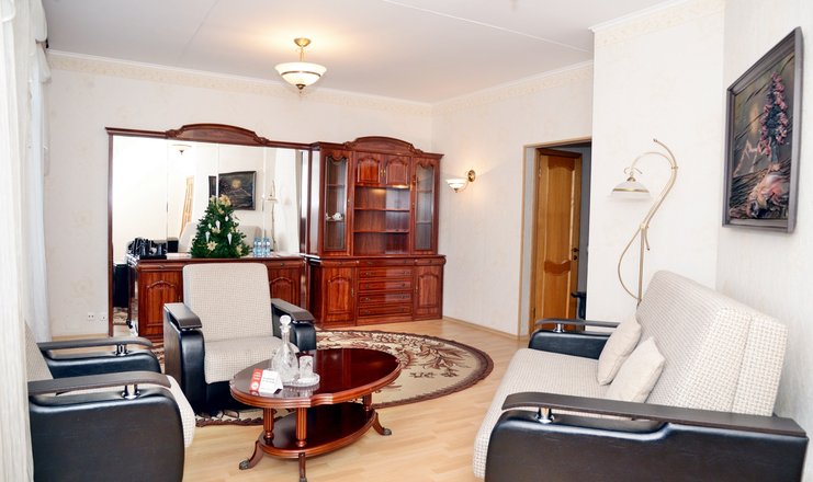 В номере: вешалка, диван, зеркало, кровать двуспальная, прикроватные тумбочки, столик туалетный, стулья, шкаф, сейф, телевизор ЖК, телефон, холодильник, чайная станция