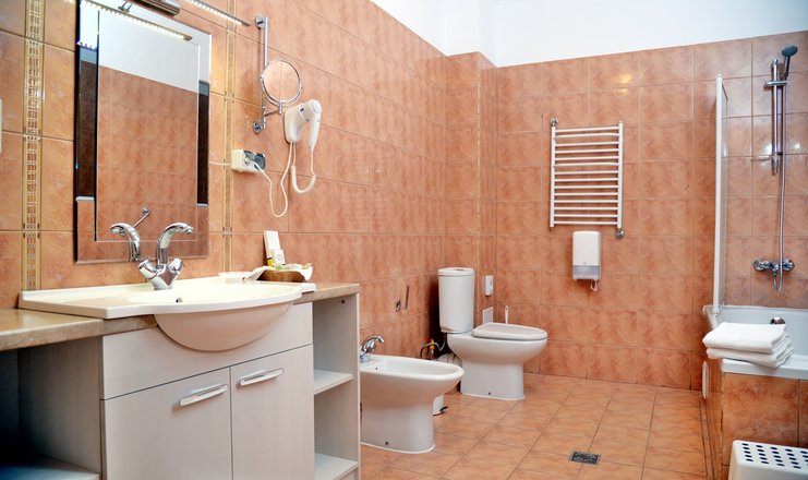 Санузел: биде, с ванной, тапочки, туалетные принадлежности, фен, халат