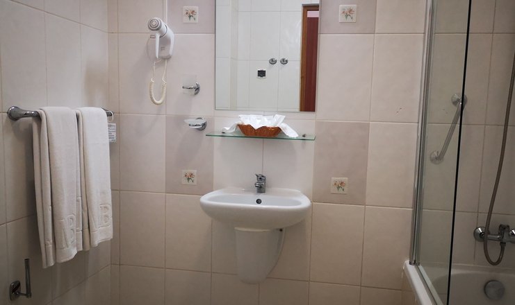 Санузел: с душевой кабиной, тапочки, туалетные принадлежности, фен