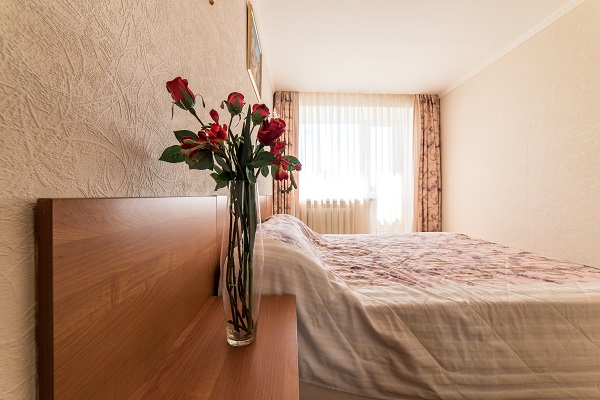 В номере: две комнаты: спальня и гостиная, две односпальные кровати, прикроватные тумбы, шкаф, журнальный столик, раскладной диван, стенка, телевизор, холодильник, чайный набор посуды, электрочайник