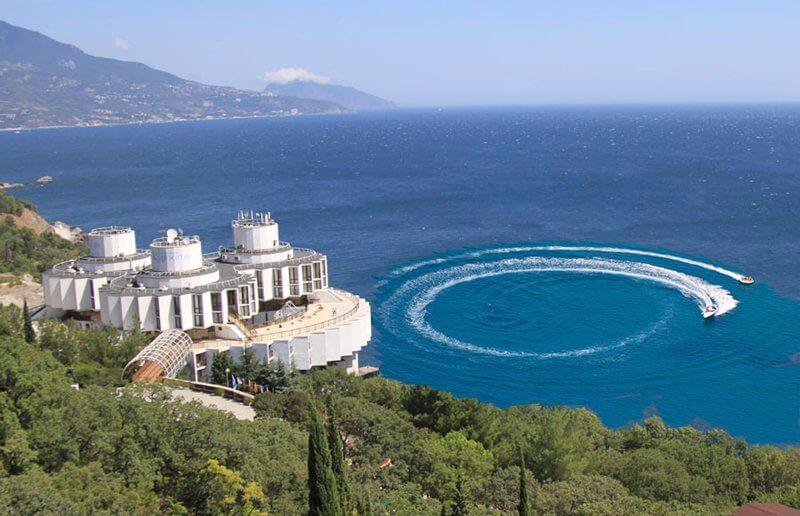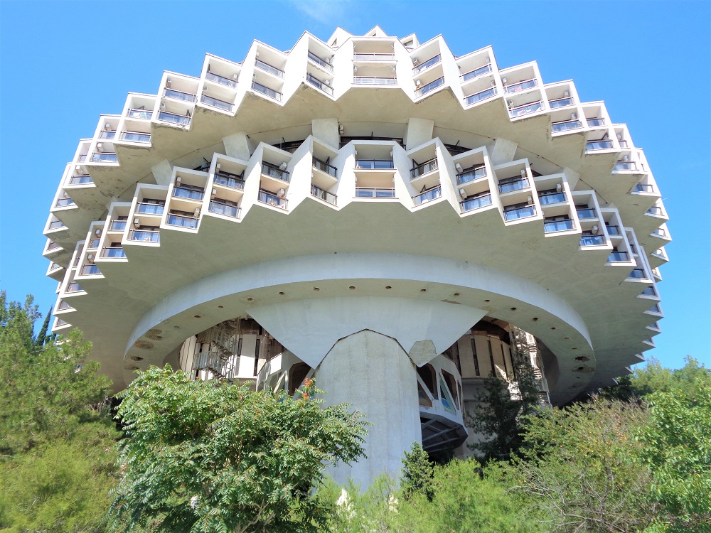 Здание санатория оригинальной конструкции часто сравнивают с летающей тарелкой: основной корпус круглой формы установлен на трех опорных башнях.
