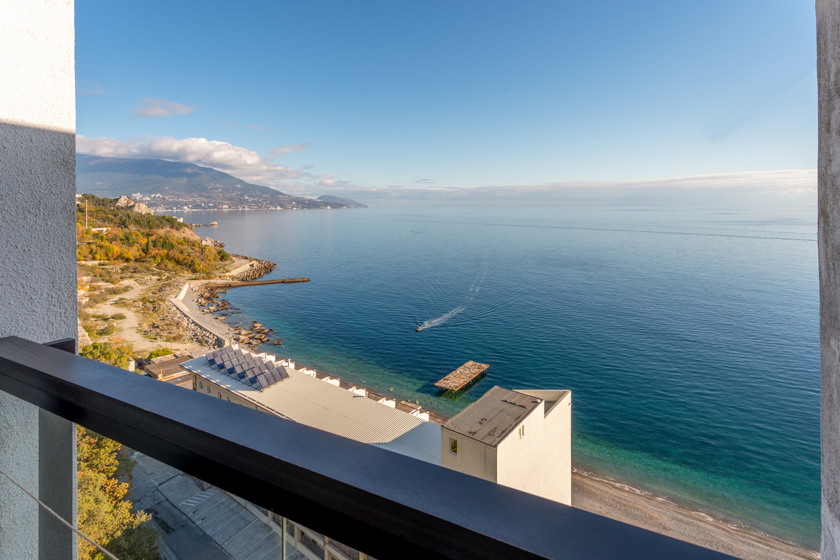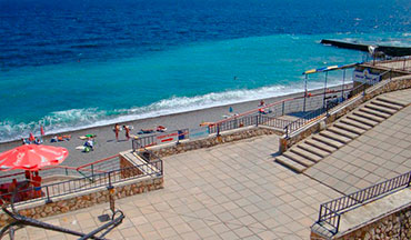 Спуск к морю осуществляется на лифте, который расположен внутри здания. Пляж оборудован лежаками, теневыми зонами, туалетом, душем, кафе.