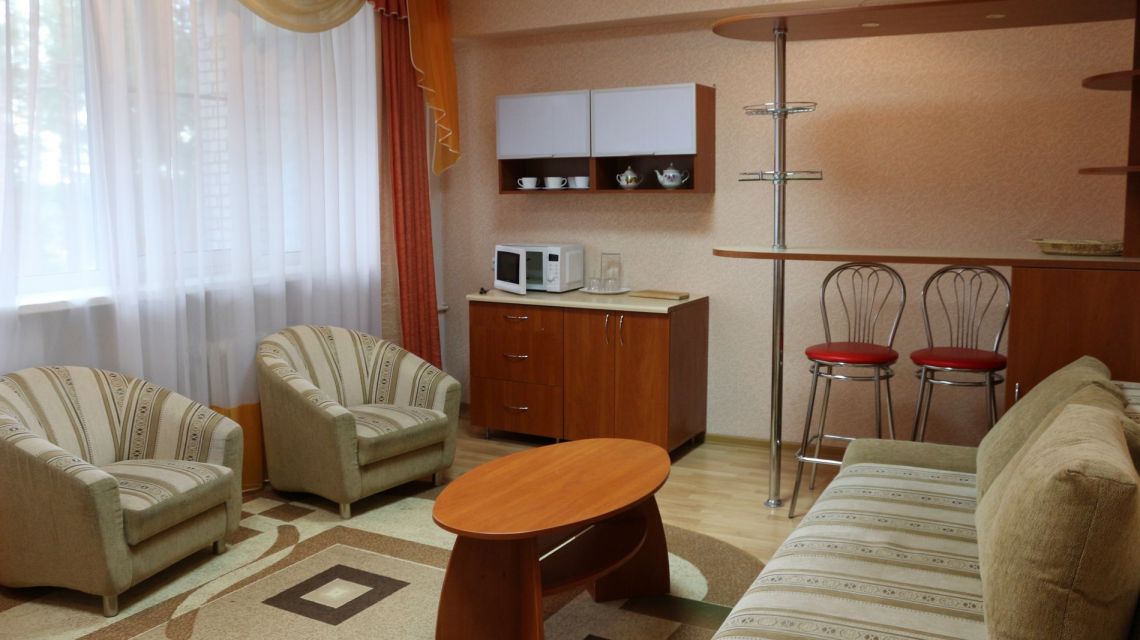 В номере: две комнаты: спальня и гостиная, двуспальная или односпальная кровать, прикроватные тумбы, стулья, стол журнальный, мягкая мебель (диван и кресла), шкаф, кухонный уголок. барная стойка, микроволновая печь, электрочайник, холодильник, телевизор, набор посуды