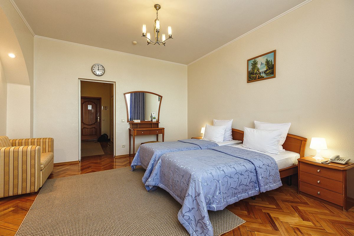 В номере: две односпальные кровати или рдна двуспальная, прикроватные тумбочки, шкаф, столик журнальный, туалетный столик, телевизор, телефон, чайник, холодильник, сушилка для белья