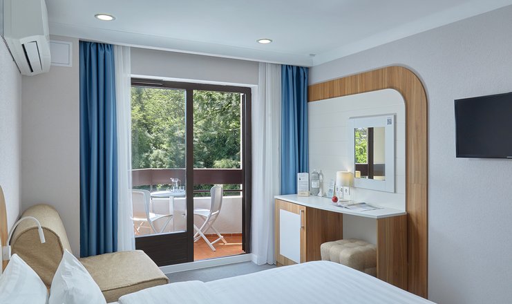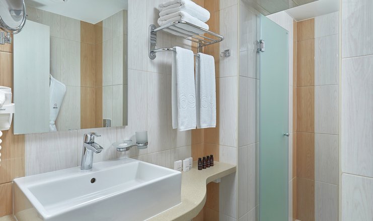 Оснащение номера: зеркало, кровати односпальные /одна двуспальная кровать, прикроватные тумбочки: и лампа настольная, стол, стул, тумба багажная, шкаф-купе, гладильная доска, мини-холодильник, сейф, сплит-система, телевизор ЖК: 32 дюйма, телефон, утюг, чайная станция