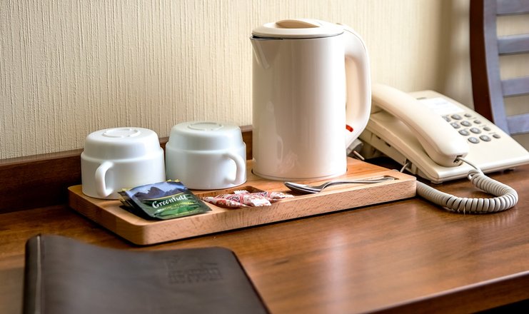 В номере: вешалка, кровати односпальные, прикроватные тумбочки, стол, стулья, шкаф, телевизор ЖК, телефон, холодильник, чайный набор посуды, электрочайник