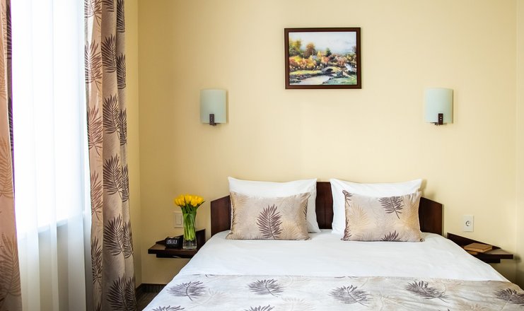 В номере: вешалка, кресло, кровать двуспальная, прикроватные тумбочки, столик журнальный, шкаф, кондиционер, кофемашина: капсульная, телевизор ЖК, телефон, холодильник, чайный набор посуды, электрочайник