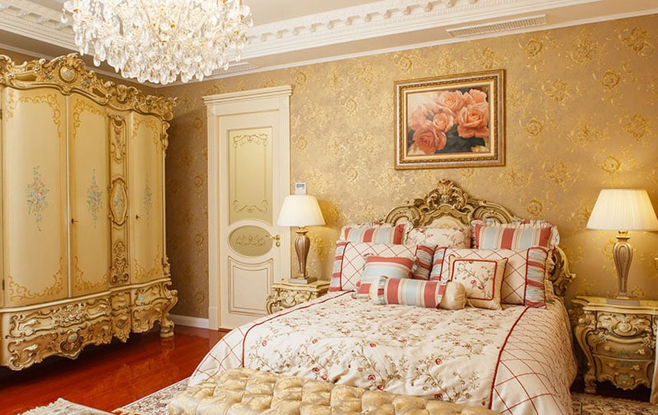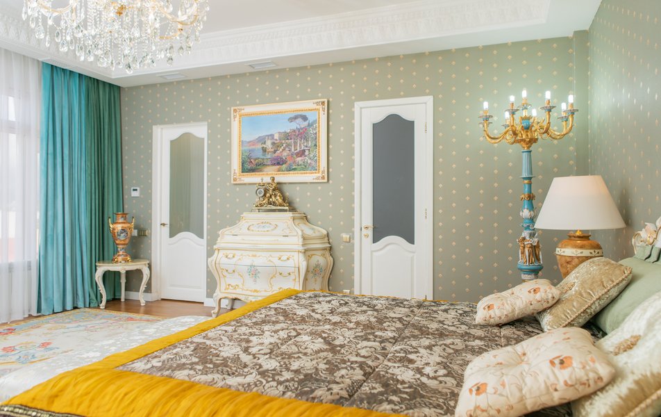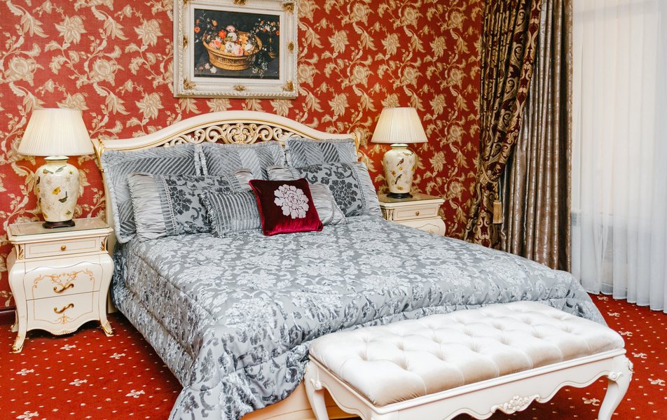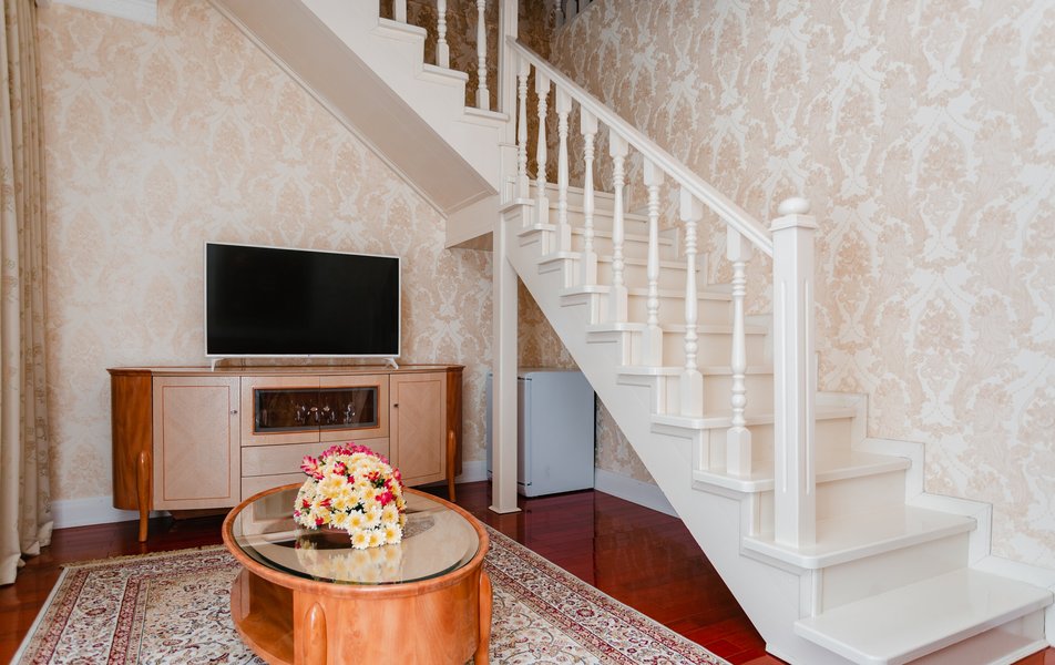 В номере: комод, кровать двуспальная, набор мягкой мебели, прикроватные тумбочки, диван, шкаф для посуды, кондиционер, телевизор, холодильник, электрочайник