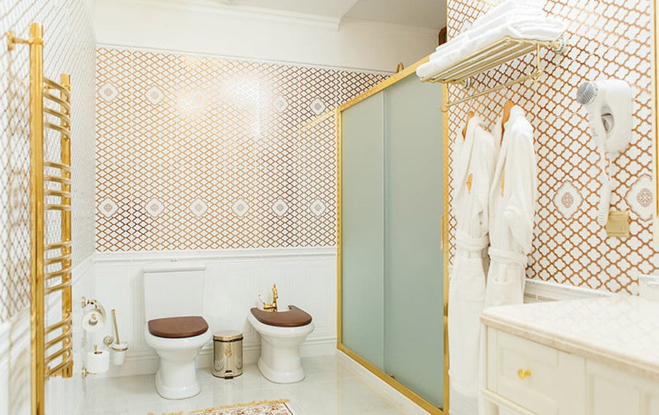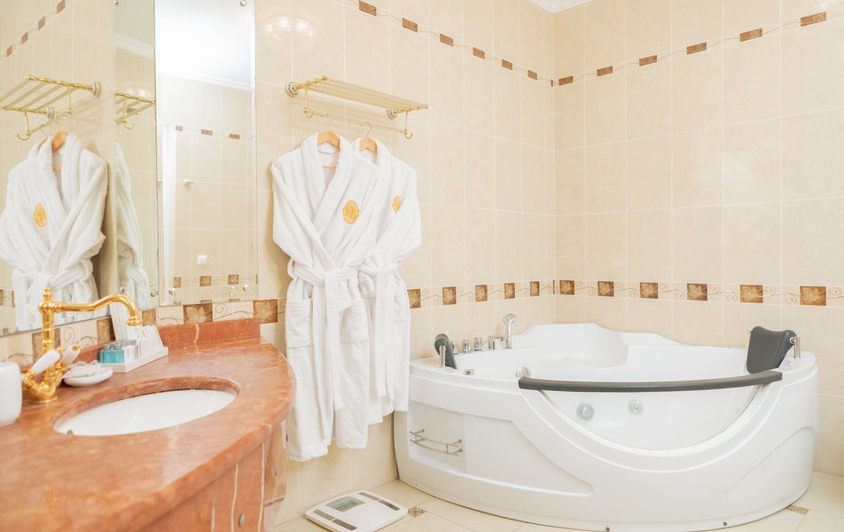 Санузел: джакузи, ванна, душевая кабина или ванна, раковина, унитаз, фен, тапочки, туалетные принадлежности